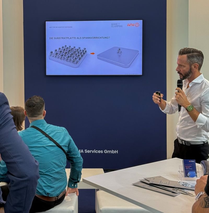 在VDMA技術(shù)論壇上,AMF銷售總監(jiān)Manuel Nau以“增材制造結(jié)合智能夾持”(Additive Fertigung trifft auf smarte Spanntechnik)為主題發(fā)表演講,重點介紹了AMF最新研發(fā)的3D打印基板解決方案。該系統(tǒng)在增材制造后處理環(huán)節(jié)中表現(xiàn)突出,可實現(xiàn)更快的工件裝夾、更高的定位精度以及顯著提升的過程穩(wěn)定性,為增材制造用戶帶來了切實可行的效率與質(zhì)量提升。